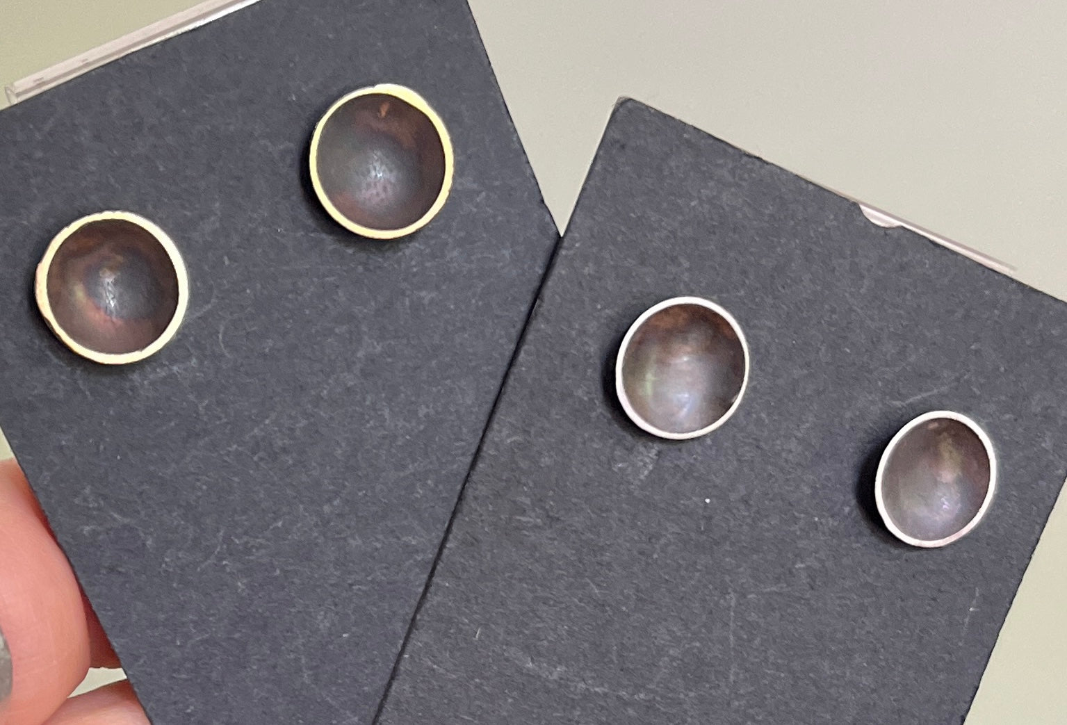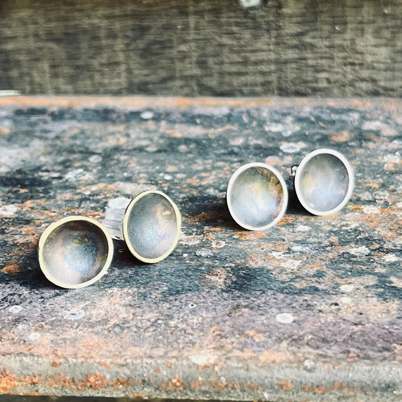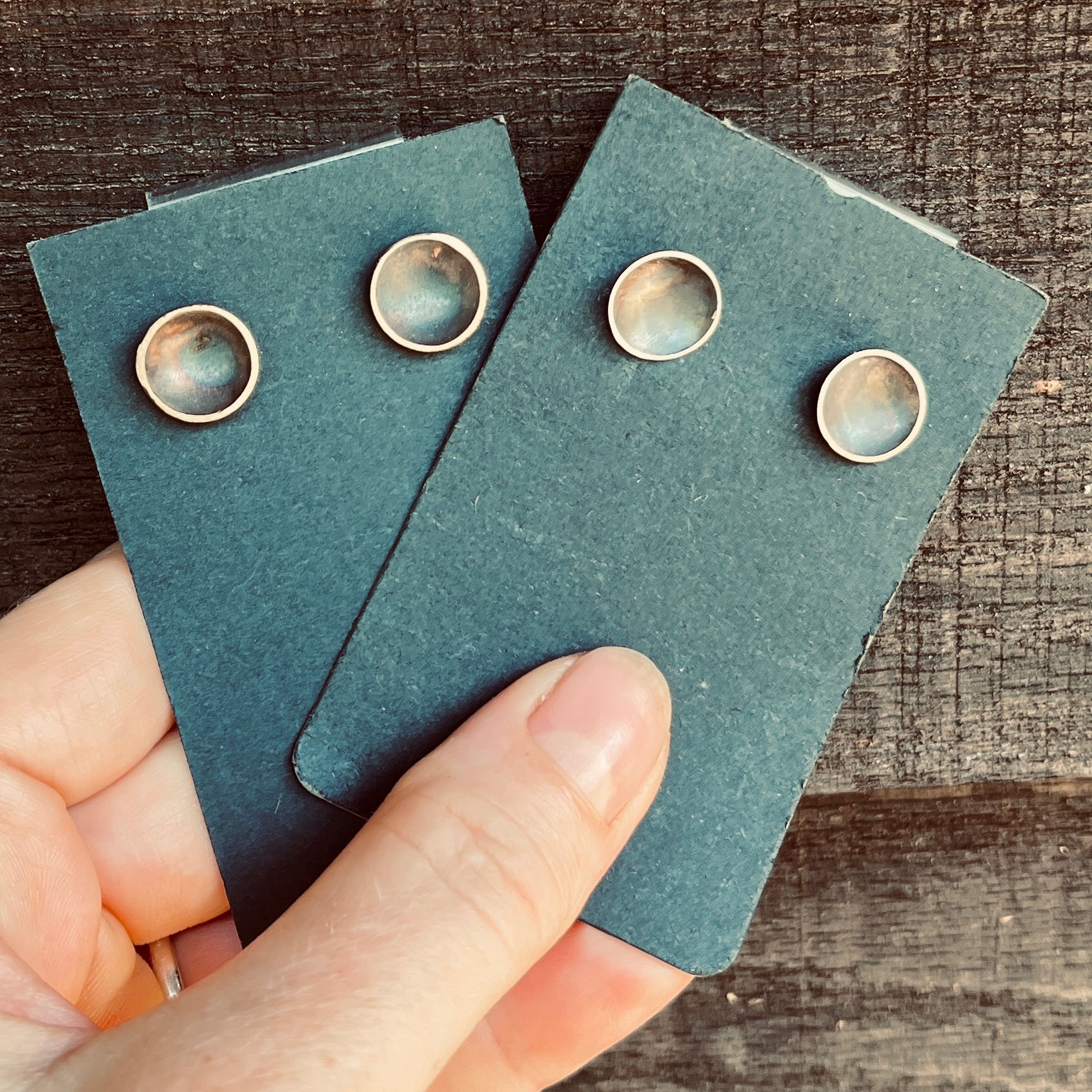 Simple Silver studs with silver posts. They are hand hammered to have a concave shape and the interior is patinated to add depth and contrast to the bright sanded edge.