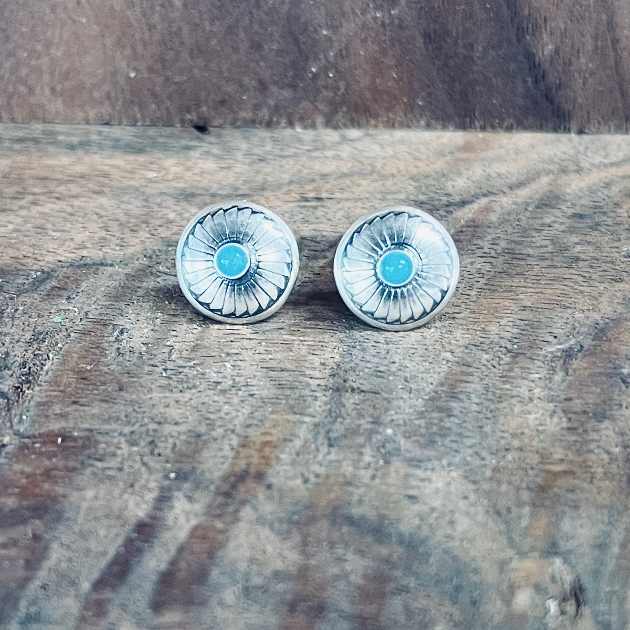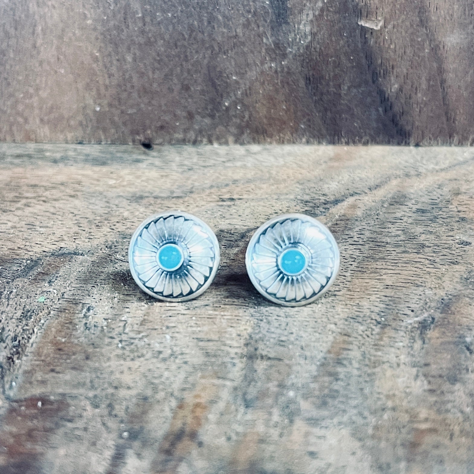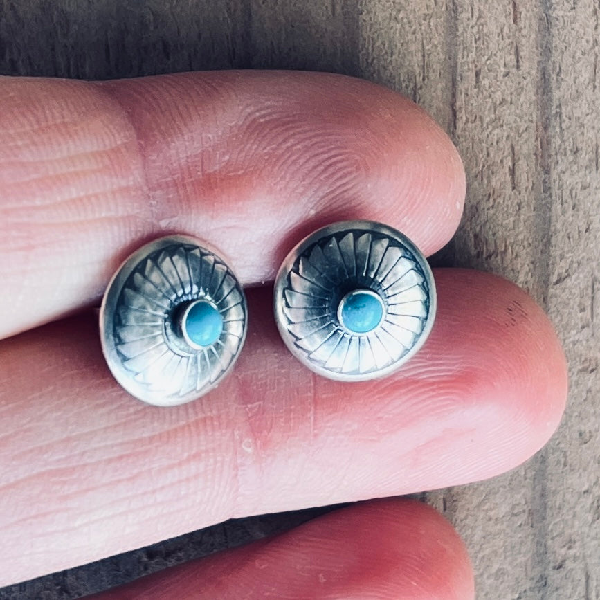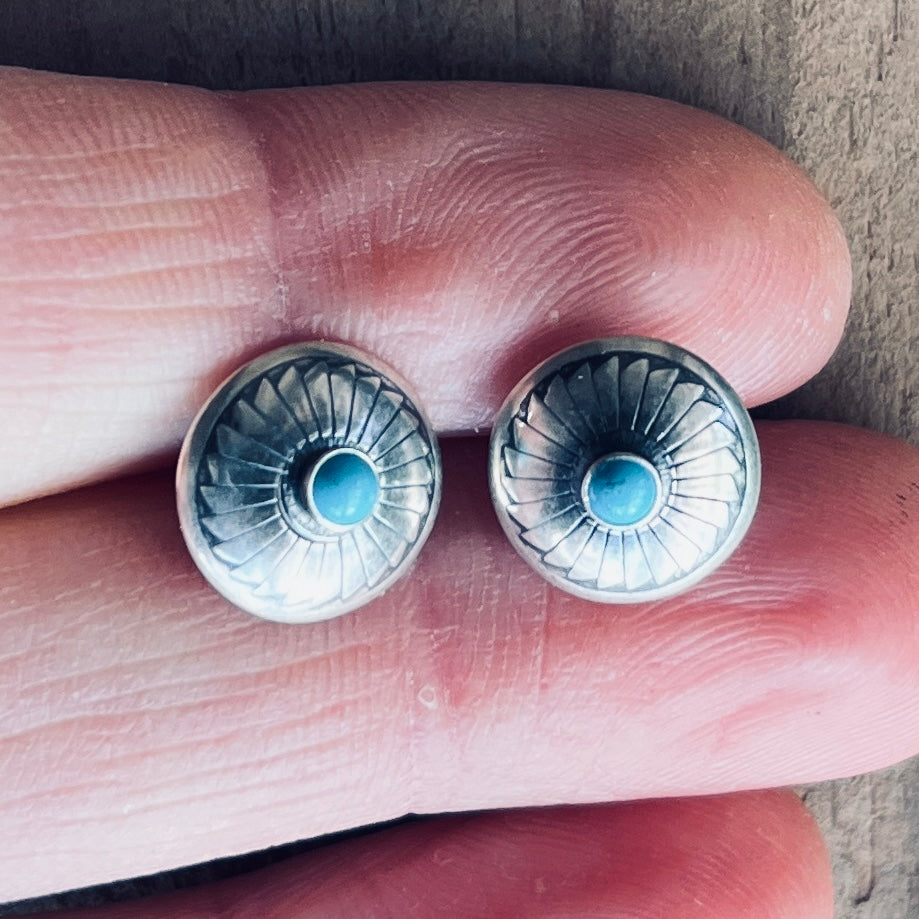 These Southwest style studs feature a 4mm piece of turquoise in sterling silver patterned circles that are 3/8" in diameter.