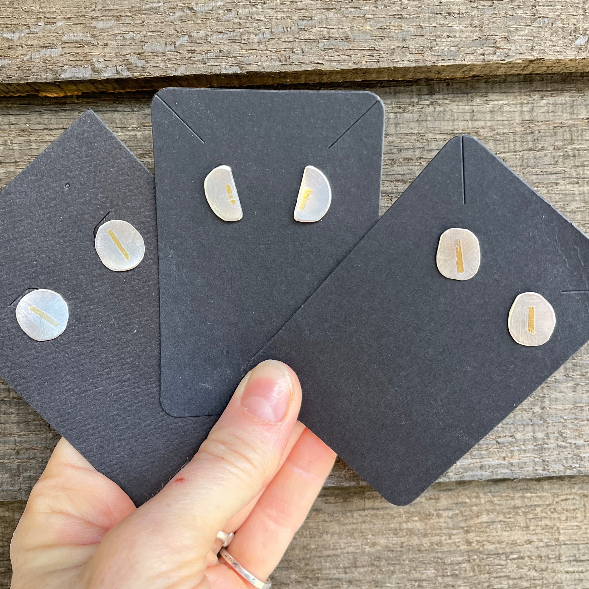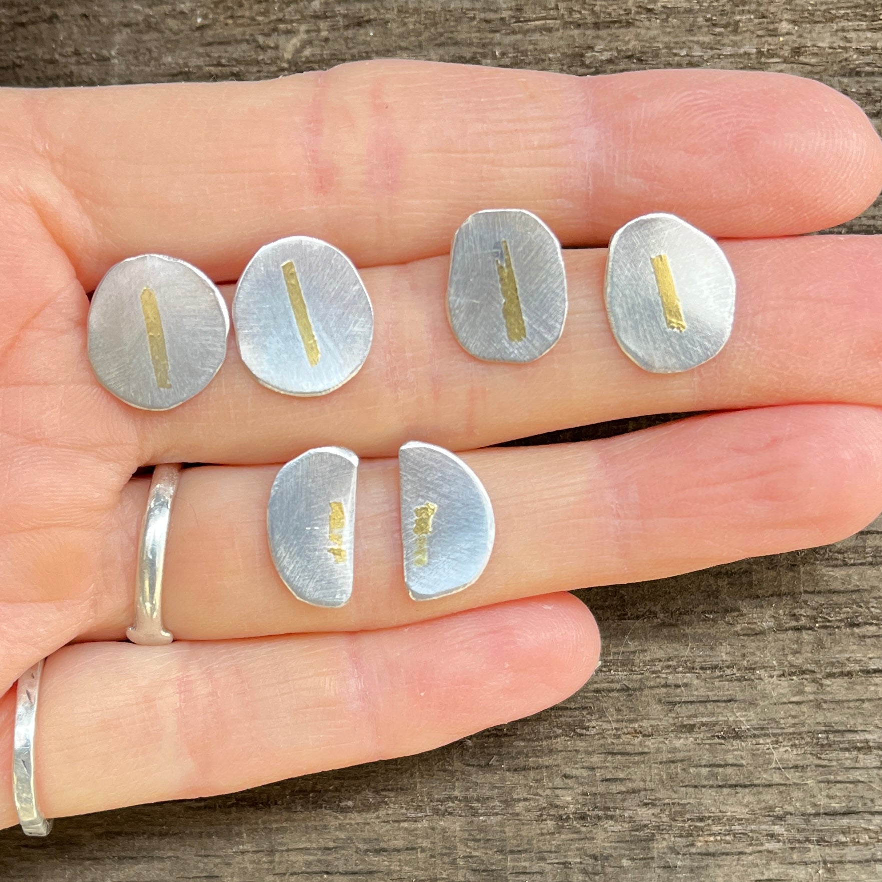 Small Sterling silver stud earrings using recycled silver and the Korean technique, Keum-boo, of fusing gold leaf to silver.