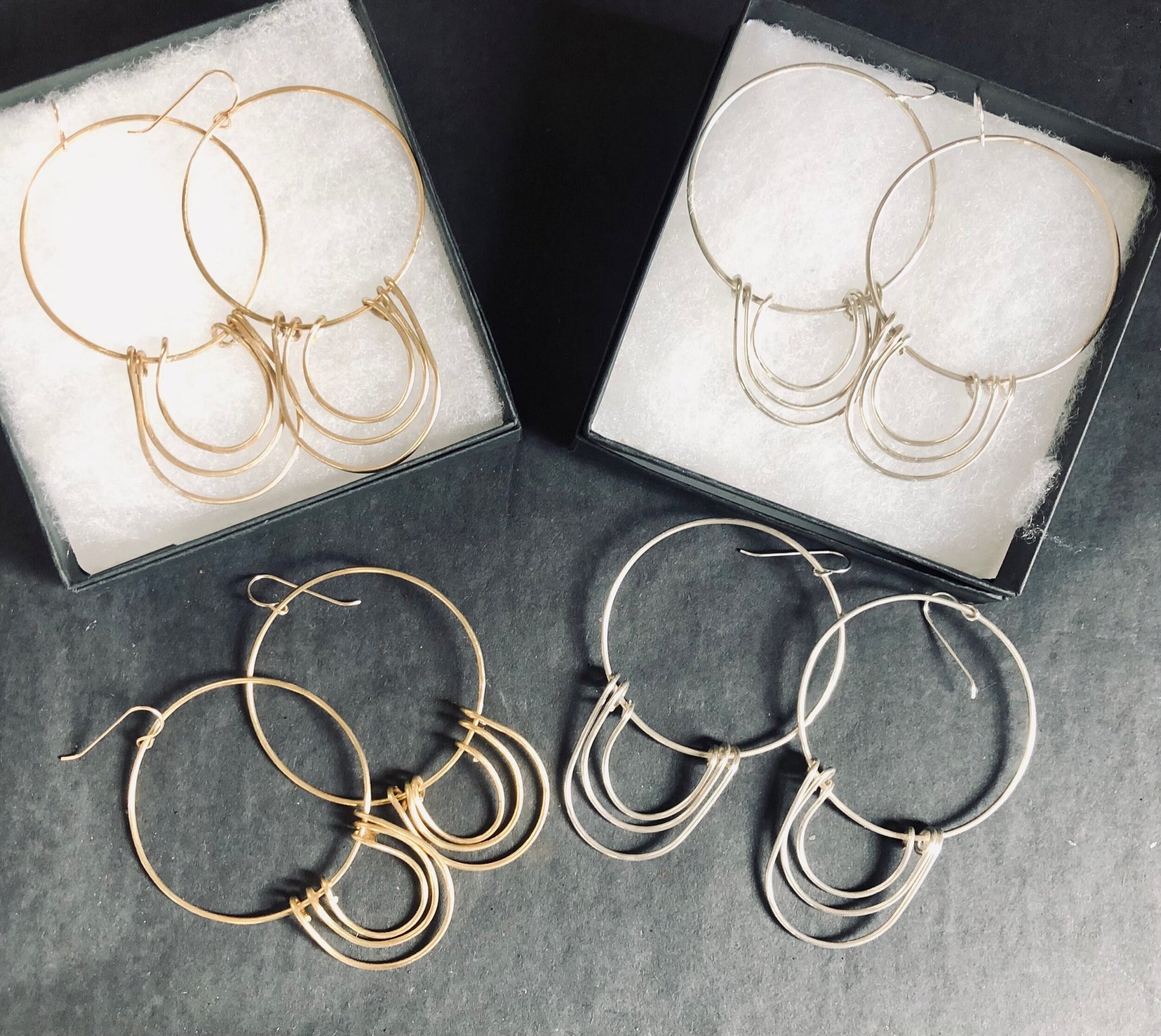 I’m excited about this design! I’ve been giving my pair a test run and they are super light and comfortable. They also get lots of compliments. The movement from the bottom geometric shapes feels fun and pretty. These are Sterling Silver with Sterling silver ear wires.